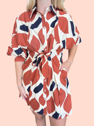 Geometric print short sleeve midi dress featuring button closure at front