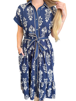 Floral print long sleeve midi dress featuring V-neckline and covered buckle belt.