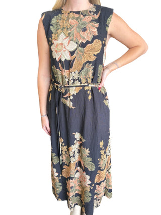 Floral print sleeveless midi dress featuring round neckline