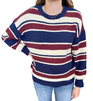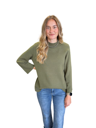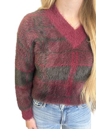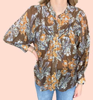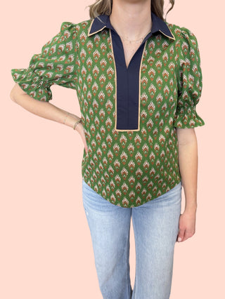 Geometric print 3/4 puff sleeve top featuring contrast trim split V-neck
