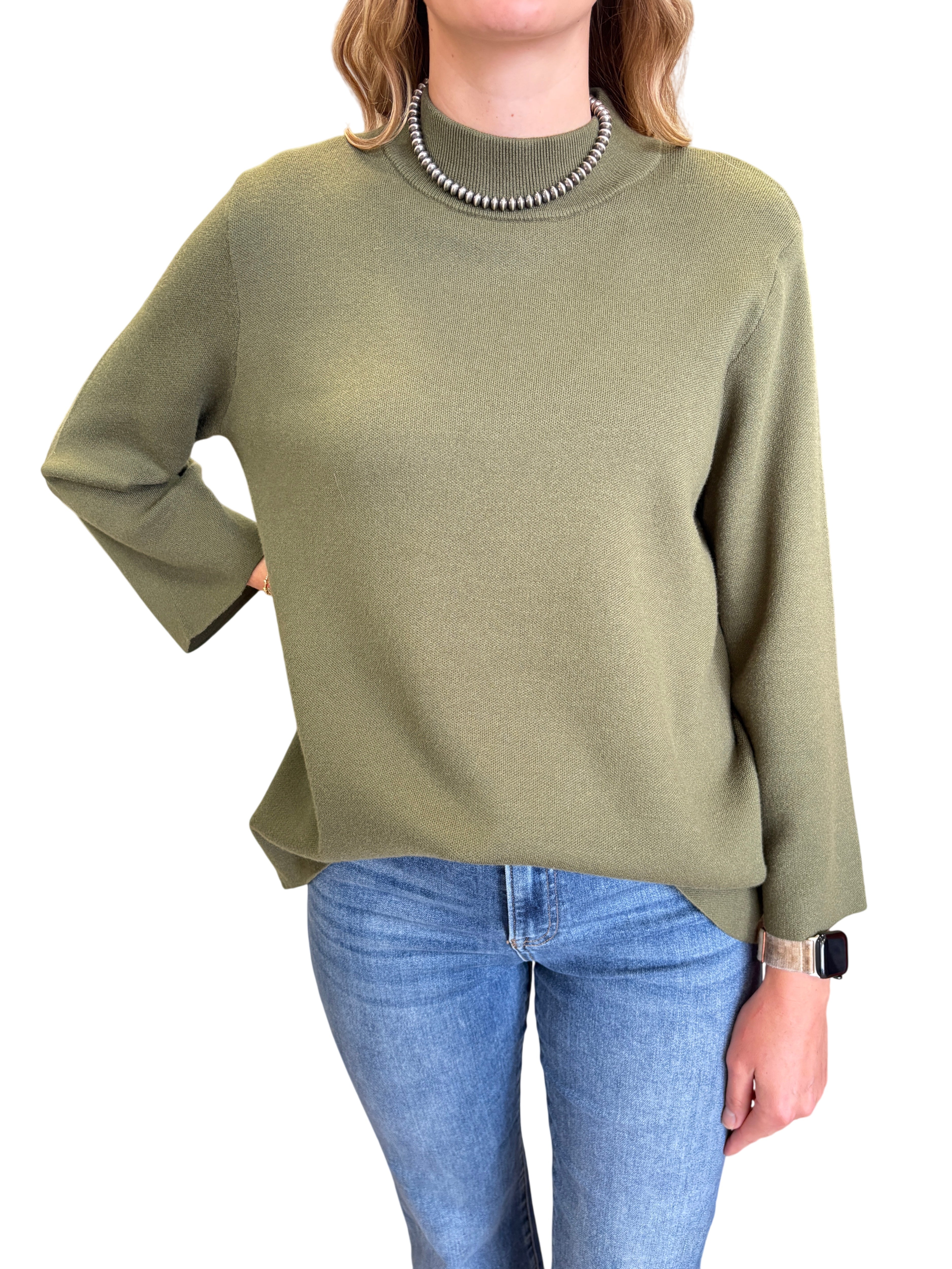 Solid mock neck 3/4 sleeve top featuring straight hem.