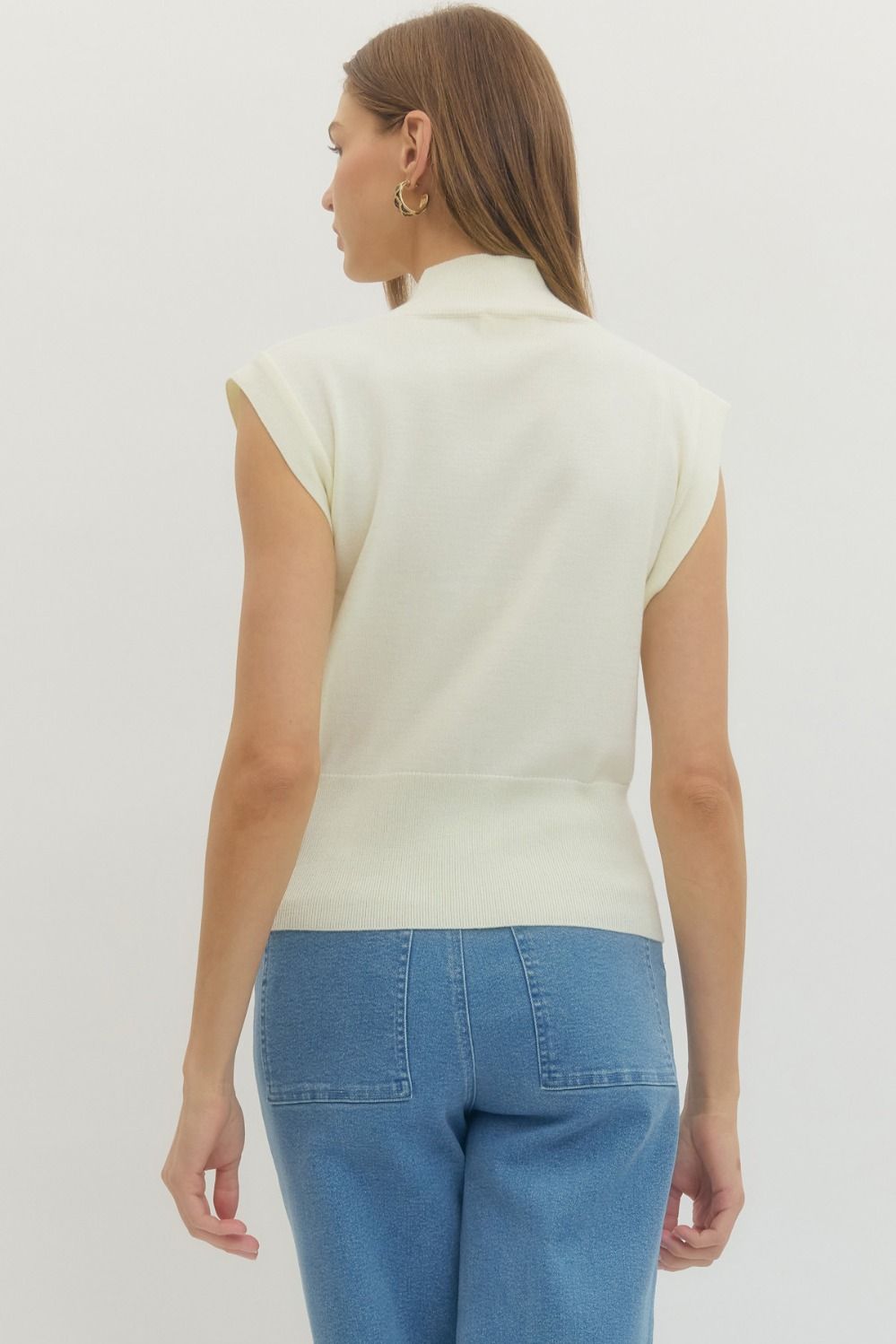 Solid mock neck sleeveless knit top featuring ribbed hem